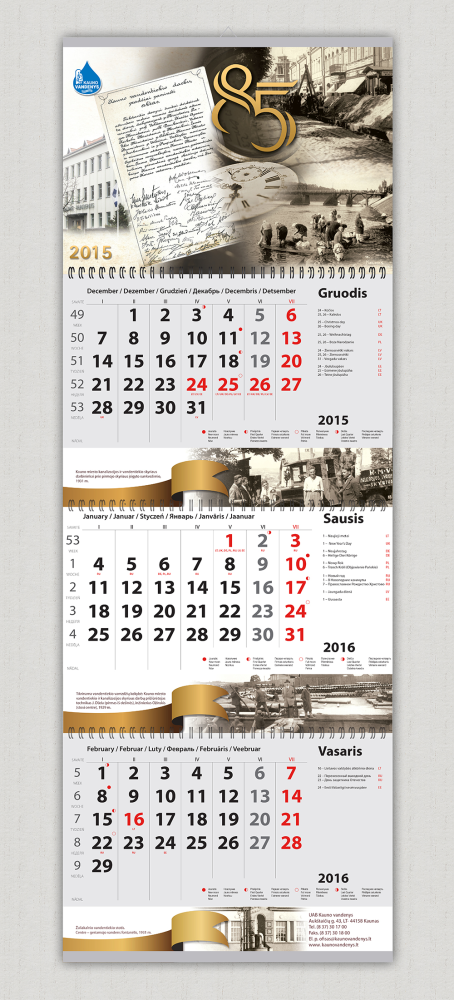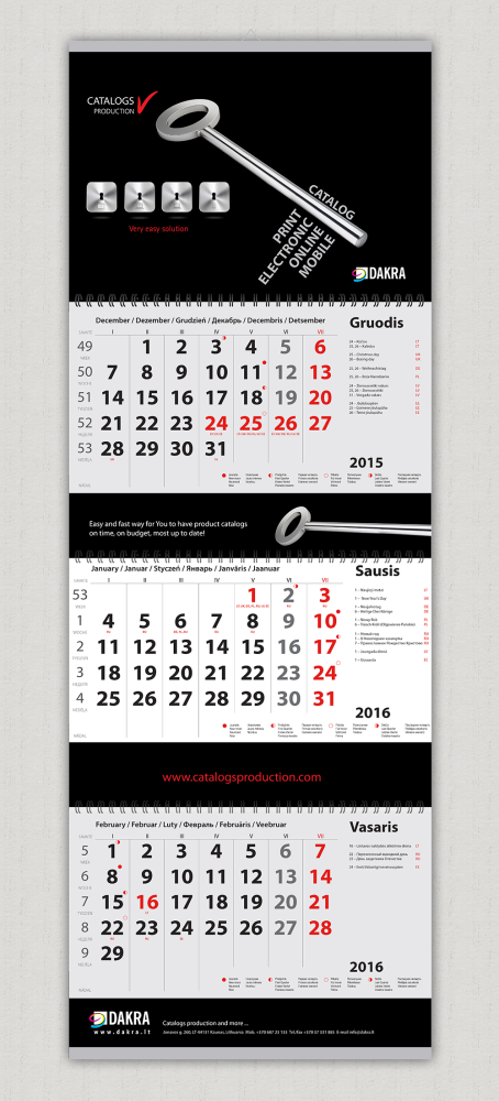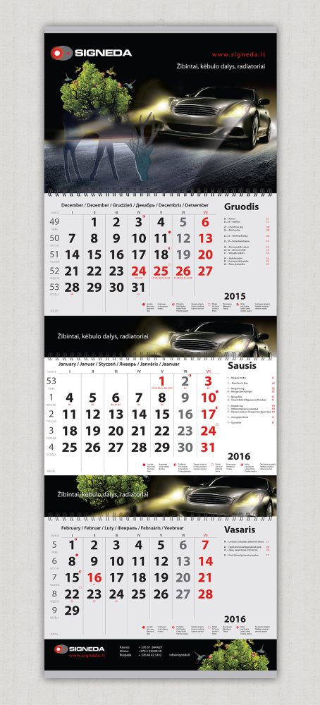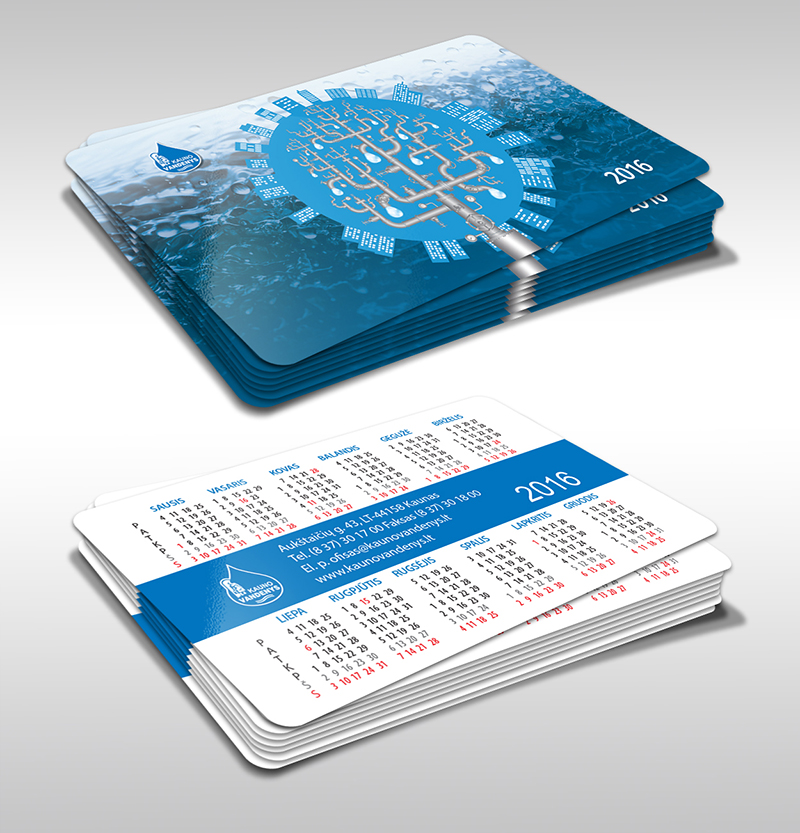Egzistuoja daug kalendorių rūšių: kišeniniai, staliniai, plakatiniai, sieniniai, užrašų knygelių tipo, prezentaciniai. Bet kokio tipo kalendorius sumaketuojame ir paruošiame gamybai pagal technologinius reikalavimus. Skirtingų rūšių vienos įmonės kalendoriams prideriname vieną idėją arba sukuriame kelias, derančias tarpusavyje ir papildančias viena kitą idėjas. Idėjos vizualizacijai parenkame originalius pieštus paveiksliukus ar fotografijas. Siekiame, kad mūsų pasiūlyti firminiai kalendoriai būtų įdomūs, kokybiški ir patogūs naudojimui.